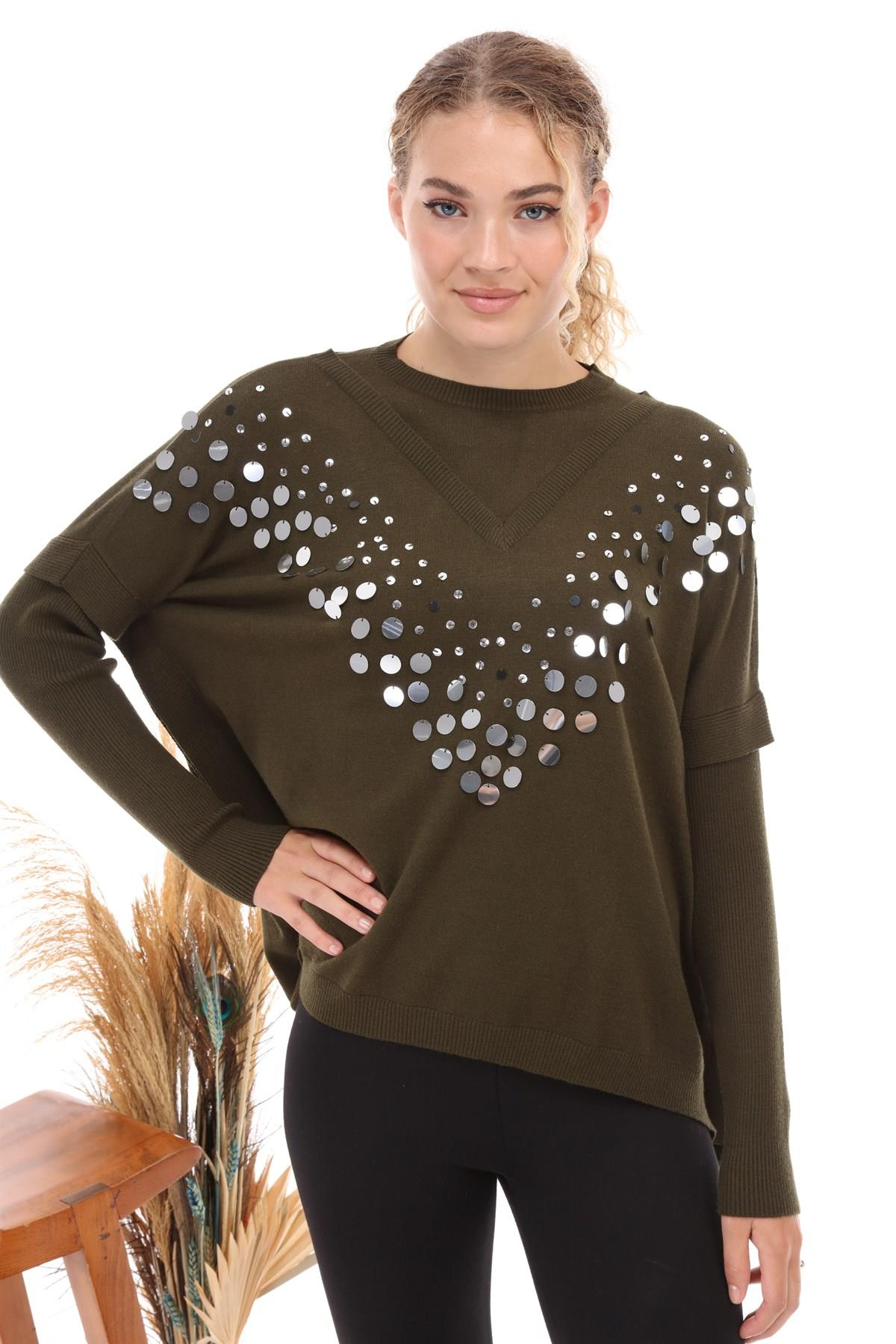 FTZ Women Kadın Önü Pul Payet İşlemeli Triko  Haki 21-1110