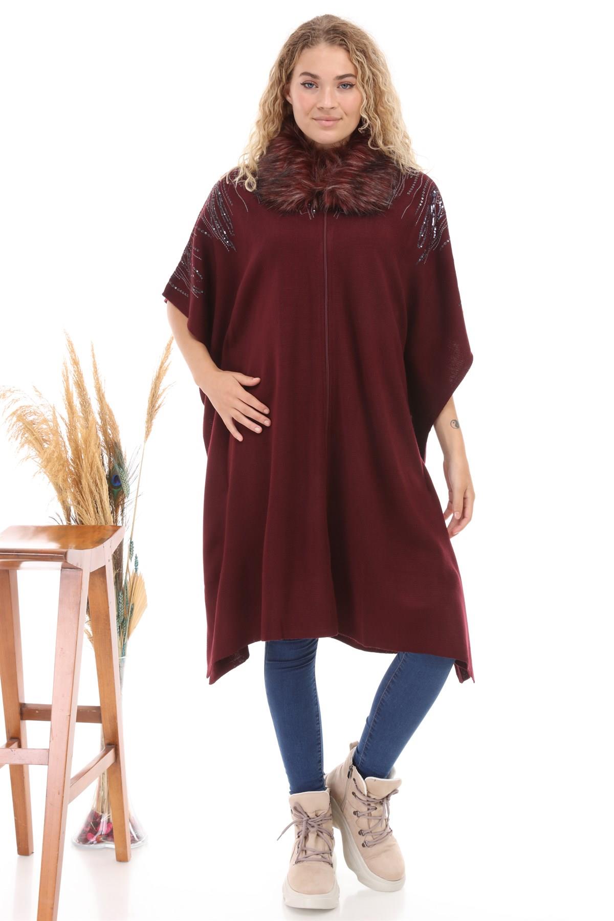 FTZ Women Kadın Yakası Kürk Detaylı Fermuarlı Panço Bordo 21-1170 (21-1170)